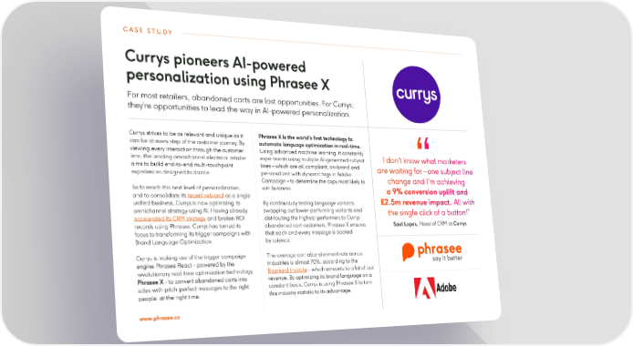 I don't know what marketers are waiting for – one subject line change and I'm achieving a 9% conversion uplift and £2.5m revenue impact. All with the single click of a button!” Saul Lopes, Head of CRM at Currys Currys strives to be as relevant and unique as it can be at every step of the customer journey. By viewing every interaction through the customer lens, the leading omnichannel electrical retailer aims to build end-to-end multi-touchpoint experiences designed to dazzle. So to reach this next level of personalization, and to consolidate its recent rebrand as a single unified business, Currys is now optimizing its omnichannel strategy using AI. Having already accelerated its CRM strategy and broken ROI records using Phrasee, Currys has turned its focus to transforming its trigger campaigns with Brand Language Optimization. Currys is making use of the trigger campaign engine Phrasee React - powered by the revolutionary real-time optimization technology Phrasee X - to convert abandoned carts into sales with pitch-perfect messages to the right people, at the right time. Phrasee X is the world’s first technology to automate language optimization in real-time. Using advanced machine learning, it constantly experiments using multiple AI-generated subject lines – which are all compliant, on-brand and personalized with dynamic tags in Adobe Campaign – to determine the copy most likely to win business. By continuously testing language variants, swapping out lower-performing variants and distributing the highest-performers to Currys’ abandoned cart customers, Phrasee X ensures that each and every message is backed by science. The average cart abandonment rate across industries is almost 70%, according to the Baymard Institute – which amounts to a lot of lost revenue. By optimizing its brand language on a constant basis, Currys is using Phrasee X to turn this industry statistic to its advantage. Currys pioneers AI-powered personalization using Phrasee X www.phrasee.co For most retailers, abandoned carts are lost opportunities. For Currys, they’re opportunities to lead the way in AI-powered personalization.