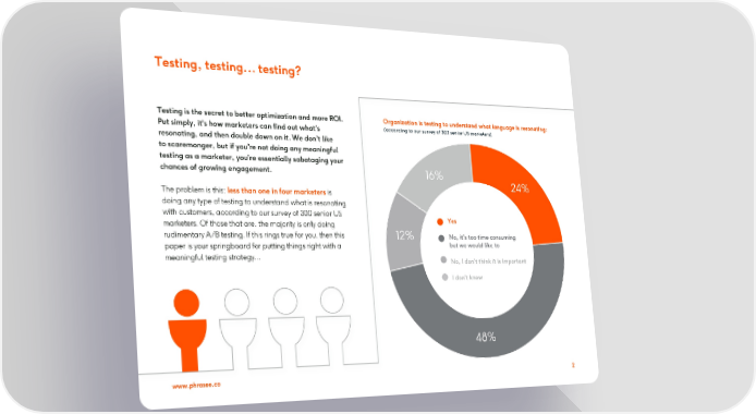 Testing, testing... testing? Testing is the secret to better optimization and more ROI. Organization is testing to understand what language is resonating: according to our survey of 300 senior US marketers) Put simply, it’s how marketers can find out what’s ( resonating, and then double down on it. We don’t like to scaremonger, but if you’re not doing any meaningful testing as a marketer, you’re essentially sabotaging your chances of growing engagement. 16% 24% The problem is this: less than one in four marketers is doing any type of testing to understand what is resonating with customers, according to our survey of 300 senior US marketers. Of those that are, the majority is only doing Yes rudimentary A/B testing. If this rings true for you, then this 12% No, it’s too time consuming paper is your springboard for putting things right with a but we would like to meaningful testing strategy... No, I don’t think it is important I don’t know 48% www.phrasee.co 2