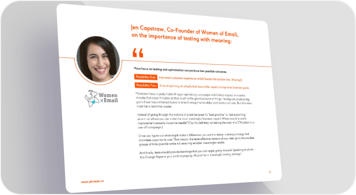 Jen Capstraw, Co-Founder of Women of Email, on the importance of testing with meaning: More focus on testing and optimization can produce two possible outcomes. Possibility One: Improved customer experience which boosts the bottom line. (Hooray!) Possibility Two: A lot of spinning of wheels that have little impact on top-level business goals. Marketers have a pesky habit of hyper-optimizing campaigns with limited impact, or creative minutia that doesn’t matter all that much in the grand scheme of things. Testing can produce big gains if you have informed talent and technology that enables optimization at scale. But otherwise, it can be a real time-waster. Instead of going through the motions of a test because it’s “best practice” to “test everything,” zero in on where you can make the most meaningful business impact. Where would a subtle improvement actually move the needle? (Tip: It’s definitely not testing the color of a CTA button in a one-off campaign.) Once you figure out what might make a difference, you want to design a testing strategy that minimizes opportunity cost. That means, the least-effective versions of your tests go to the smallest groups of folks possible while still ensuring reliable, meaningful results. And finally, tests should provide learnings that you can apply going forward. Speaking of which - this Orange Paper is your perfect jumping off point for a meaningful testing strategy!” www.phrasee.co 3