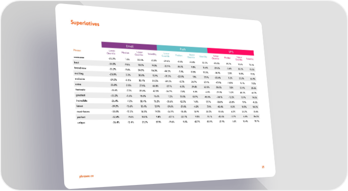 Superlatives Email Push SMS Phrase Lower Median Upper Volatility Lower Median Upper Volatility Lower Median Upper Volatility Quartile Quartile Quartile Quartile Quartile Quartile awesome -25.2% 1.6% 33.6% 65.1% -29.4% -8.6% 20.8% 32.3% -23.8% -19.7% 14.6% 70.3% best -34.0% -9.6% 18.0% 19.3% -32.9% -14.5% 9.8% 18.6% -29.8% -3.4% 32.2% 15.2% brand new -33.2% -9.6% 24.0% 54.2% -44.3% -7.5% 31.8% 99.0% -14.3% 2.8% 16.5% 17.3% exciting -20.8% 3.2% 30.8% 15.9% -35.3% -22.0% 7.1% 17.9% -20.4% 5.2% 33.2% 66.8% exclusive -29.2% -0.8% 32.4% 84.5% -24.3% -3.5% 24.7% 27.4% -47.9% -14.8% 13.1% 17.8% extra -28.8% -2.8% 27.6% 44.8% -27.1% -4.3% 29.4% 62.8% -28.0% -7.5% 32.9% 25.6% fantastic -31.6% -7.2% 22.8% 42.3% -24.7% -7.8% 8.2% 4.6% -29.5% 13.2% 48.3% 60.7% greatest -33.2% -5.6% 18.8% 16.6% 1.2% 51.0% 53.7% 48.8% -34.1% -12.2% 13.9% 74.0% incredible -26.4% -1.2% 32.4% 76.2% -30.6% -12.5% 14.1% 17.7% -33.8% -20.8% 7.9% 41.2% latest -39.2% -13.6% 12.4% 12.9% -39.6% -21.6% -4.3% 7.8% -40.4% -8.3% 18.5% 84.2% must-haves -38.0% -15.2% 14.8% 19.5% -34.9% -18.4% 14.9% 38.5% -18.6% 4.2% 26.2% 13.4% perfect -32.4% -9.6% 18.0% 9.4% -47.1% -22.7% 9.8% 70.1% -42.6% -17.7% 6.4% 86.3% unique -36.4% -12.4% 21.2% 57.1% -19.6% 9.8% 42.7% 85.9% -21.9% -1.6% 18.4% 78.7% phrasee.co 25