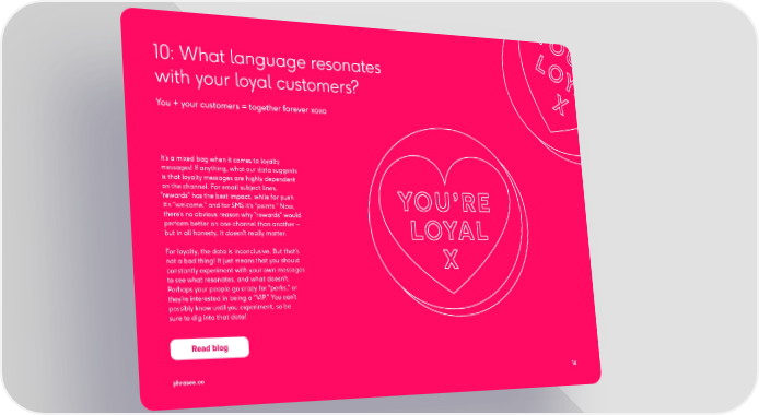 YOU 10: What language resonates LO ’RE with your loyal customers? YAL X You + your customers = together forever xoxo It’s a mixed bag when it comes to loyalty messages! If anything, what our data suggests is that loyalty messages are highly dependent on the channel. For email subject lines, “rewards” has the best impact, while for push it’s “welcome,” and for SMS it’s “points.” Now, there’s no obvious reason why “rewards” would perform better on one channel than another – but in all honesty, it doesn’t really matter. For loyalty, the data is inconclusive. But that’s not a bad thing! It just means that you should constantly experiment with your own messages to see what resonates, and what doesn’t. Perhaps your people go crazy for “perks,” or they’re interested in being a “VIP.” You can’t possibly know until you experiment, so be sure to dig into that data! phrphrasee.coasee.co 1414