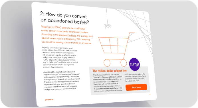 2: How do you convert an abandoned basket? Tapping into FOMO seems to be an effective way to convert those pesky abandoned baskets. According to the Baymard Institute, the average cart abandonment rate is a staggering 70%, meaning you could be missing out on a whole lot of revenue. “Expiring” is the highest-performing word across subject lines, SMS, and push – it makes customers worry that their cart of goodies will sell out, so it can be an effective way to nudge them into action. Playing with other FOMO-adjacent phrases, such as “running low” or “selling out” could also work to remind customers that the clock is ticking on the products they’re coveting. Abandoned baskets fall into the bucket of The million-dollar subject line “trigger campaigns” – the message is “triggered” When Currys joined forces with Phrasee, In fact, this campaign led to a 9% by the customer doing something – in this case, Movable Ink, Adobe, and Merkle, they found conversion rate uplift across Currys’ leaving their cart of goods without checking out. themselves a million-dollar subject line – or, abandoned baskets and double This gives you a great opportunity to constantly more specifically, a $3.4m subject line! the website visits. Nice! experiment with your abandoned basket We worked with Currys to optimize its messages over time to see which language abandoned basket campaign, and our nudges your customers over the finish line. AI-powered messages helped Currys make Read more millions more in yearly incremental revenue. phrasee.co 6