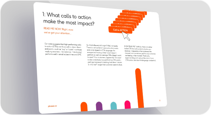 Call to ACTION Call to ACTION Call to ACTION 1: What calls to action Call to ACTION Call to ACTION make the most impact? Call to ACTION Call to ACTION Call to ACTION READ ME NOW! Right, now we’ve got your attention... Our data suggests that high-performing calls So, that’s the end of it right? Well, not quite. NOW READ ME! Truthfully, there is no silver to action (CTAs) are those with a clear, direct There’s a whole lot of nuance to what works bullet CTA that will suddenly double your end point – such as “buy” or “claim” – or those and what doesn’t in CTA language. An revenue. It depends on the audience, the implying newness – for instance, “introducing” unexpected finding is that “save” doesn’t channel, and sometimes just the way customers performs well in email subject lines and SMS. perform so well on average. Who doesn’t want are feeling in the moment. That’s why to save? Your customers, apparently! “Discover” experimenting with not just the color of your is also a relatively low-performing CTA word – CTA button, but also the language, is essential. perhaps because it’s lacking that direct “what’s in it for me?” angle that customers seem to love. phrasee.co 5