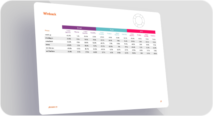 Winback Email Push SMS Phrase Lower Median Upper Volatility Lower Median Upper Volatility Lower Median Upper Volatility Quartile Quartile Quartile Quartile Quartile Quartile catch up -25.2% 1.6% 33.6% 65.1% -29.4% -8.6% 20.8% 32.3% -23.8% -19.7% 14.6% 70.3% checking in -34.0% -9.6% 18.0% 19.3% -32.9% -14.5% 9.8% 18.6% -29.8% -3.4% 32.2% 15.2% come back -33.2% -9.6% 24.0% 54.2% -44.3% -7.5% 31.8% 99.0% -14.3% 2.8% 16.5% 17.3% renew -20.8% 3.2% 30.8% 15.9% -35.3% -22.0% 7.1% 17.9% -20.4% 5.2% 33.2% 66.8% we miss you -29.2% -0.8% 32.4% 84.5% -24.3% -3.5% 24.7% 27.4% -47.9% -14.8% 13.1% 17.8% we’ll be here -28.8% -2.8% 27.6% 44.8% -27.1% -4.3% 29.4% 62.8% -28.0% -7.5% 32.9% 25.6% phrasee.co 27